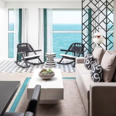 Unwind in a luxuriously large living area featuring floor to ceiling panoramic windows. The Royal Suite features the Cashmere™ Mattress, a primary bathroom with a large soaking tub, a separate shower, a double sink vanity, and a spacious private veranda. No matter where you are in this suite, you’ll enjoy stunning views of the sea, the way every royal should.